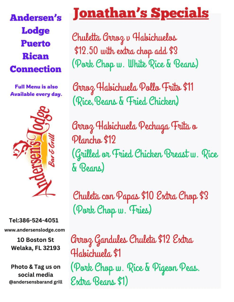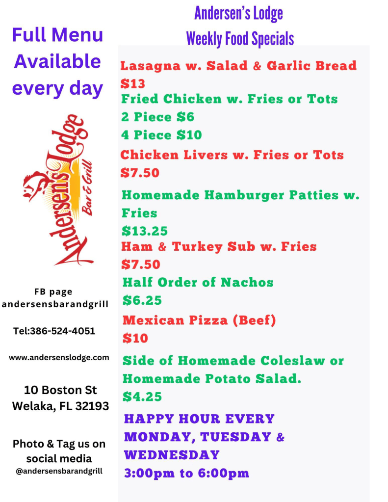Now you can come to Andersen’s and stay! The Grill is now open, so you can have drinks, grab some food and stay overnight with us. Call 386-524-4051 for “To go Orders.”